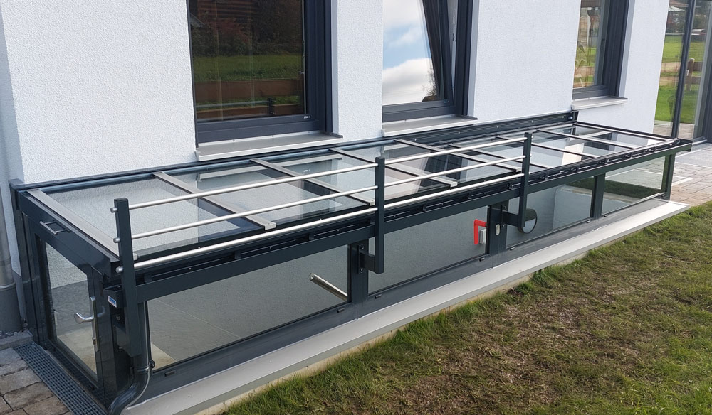 Die durchdachte Konstruktion fügt sich harmonisch in die Umgebung ein. Zum freien Zugang der Treppen oder auch im Sommer kann das Dach problemlos zurückgeschoben werden.
